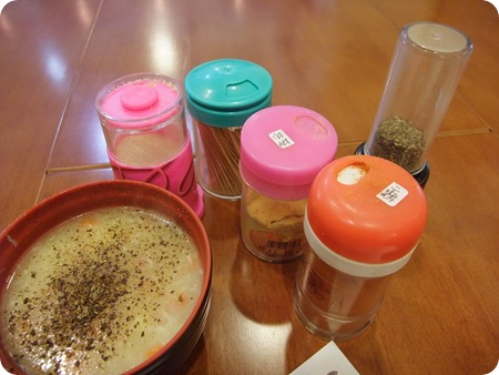 調味料與濃湯,是簡單的玉米濃湯,濃湯味道普通,但裡面料超多。