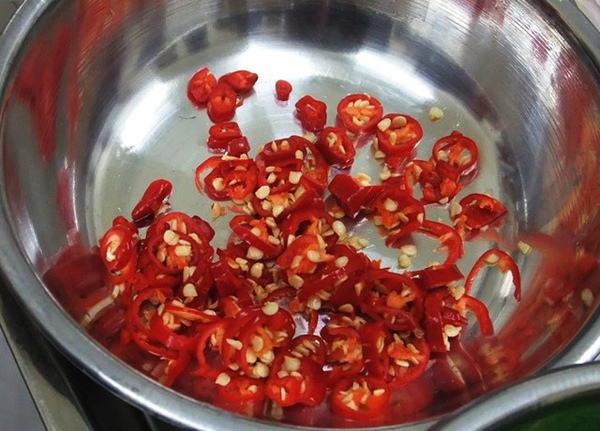 3.拌勻後再加入小辣椒片及檸檬葉細絲繼續拌