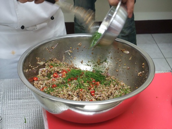 2.將紅蔥頭絲.炒糯米粉.乾辣椒粉.魚露.檸檬汁.白砂糖.味粉及雞粉與炒熟的豬絞肉一起拌