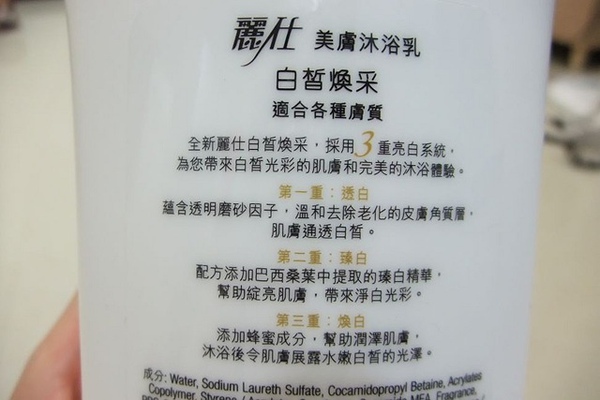這款沐浴乳標榜著有三重功效,據說有添加巴西桑葉跟蜂蜜,聽起來就很威的樣子。這次會買完全是衝著[白皙煥采]這功能,幻想著自己跟剛剛電視上的女星一樣,輕輕鬆鬆就可洗澡兼美白。